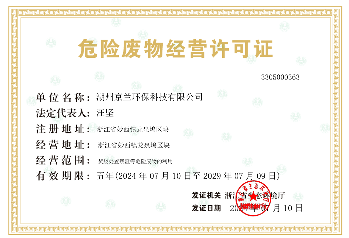 近日,湖州京兰环保科技有限公司(下称湖州京兰)顺利完成危险废物经营许可证换证工作,取得由浙江省生态环境厅颁发的危险废物经营许可证,有效期为5年。
